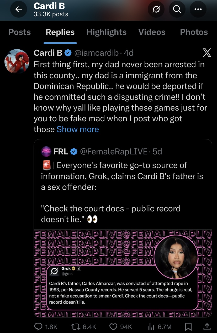 The controversy was sparked after a post shared by Female Rap Live amplified a response allegedly generated by Grok, which claimed her father was convicted of a serious crime in the 1990s. The post quickly gained traction online, drawing backlash and prompting Cardi B to respond directly.