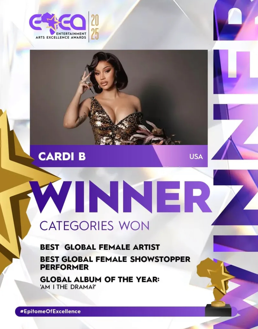 Global music superstar Cardi B has been announced as one of the standout winners at the 2025 Entertainment Arts Excellence Awards (EAEA), taking home three top categories and reinforcing her impact on the global music and entertainment landscape.