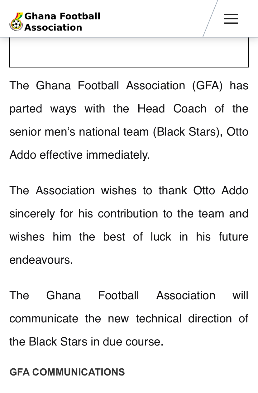 The GFA expressed appreciation for Addo’s service and contribution to Ghana football, acknowledging his role during a transitional period for the team.