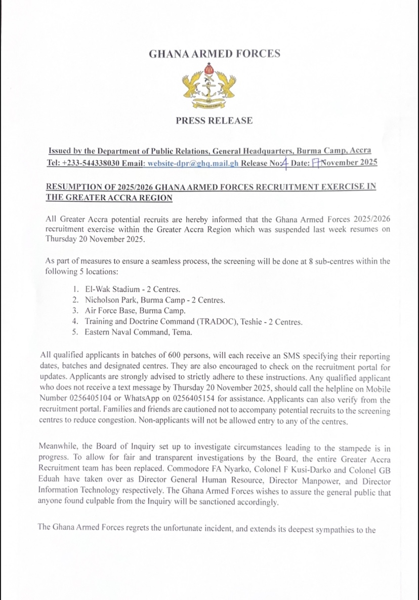 The Ghana Armed Forces (GAF) has officially announced the resumption of the 2025/2026 recruitment exercise in the Greater Accra Region, following a temporary suspension. According to a press statement issued by the Department of Public Relations at Burma Camp, the exercise will continue on Thursday, 20th November 2025, across eight designated sub-centres.