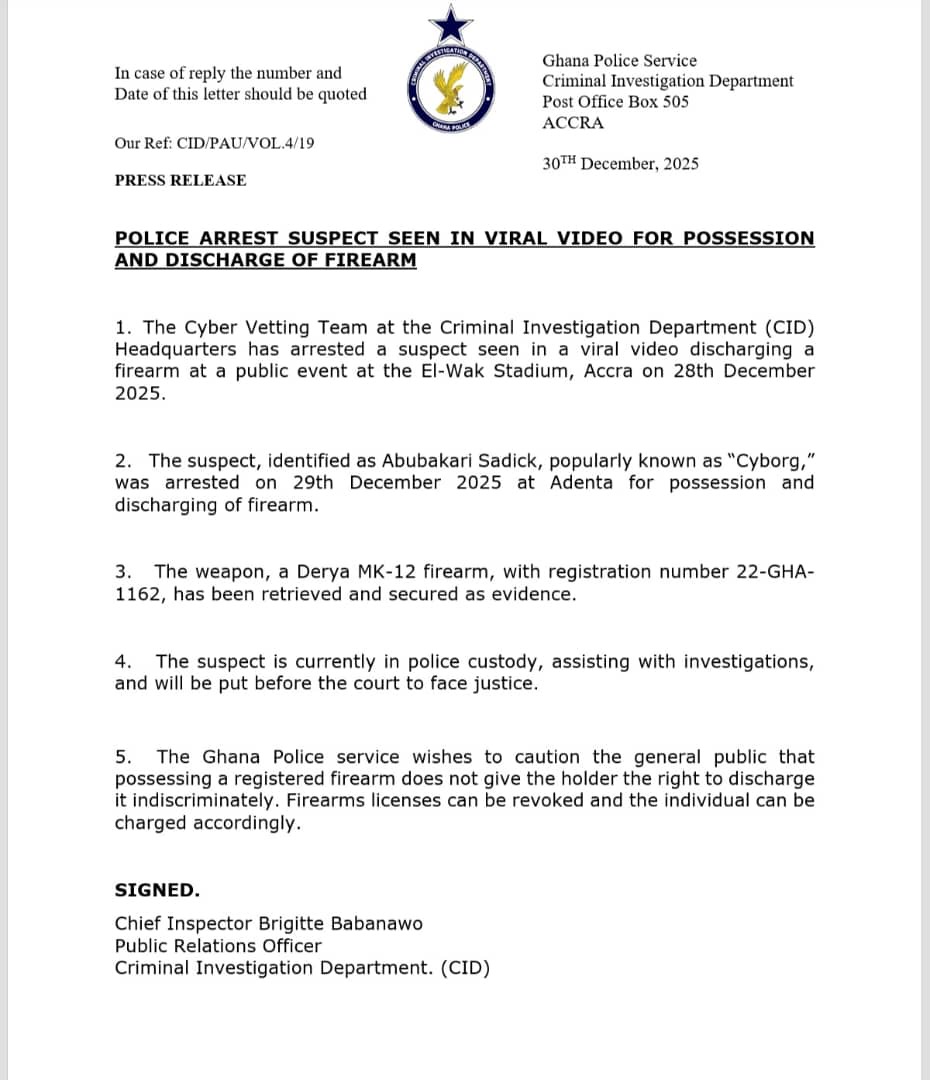 The suspect, identified as Abubakari Sadick, popularly known as "Cyborg," was taken into custody on December 29, 2025, in Adenta. The arrest follows an investigation by the CID’s Cyber Vetting Team into a video depicting Sadick firing a weapon at El-Wak Stadium in Accra on December 28.