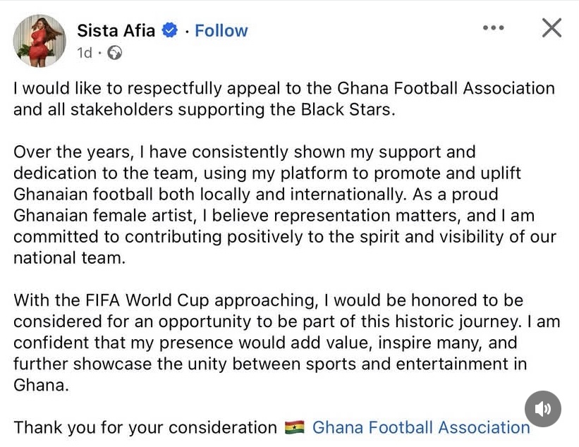 Ghanaian musician Sista Afia has made a respectful appeal to the Ghana Football Association (GFA) and all stakeholders supporting the Black Stars, expressing her desire to contribute to the team’s journey ahead of the FIFA World Cup.