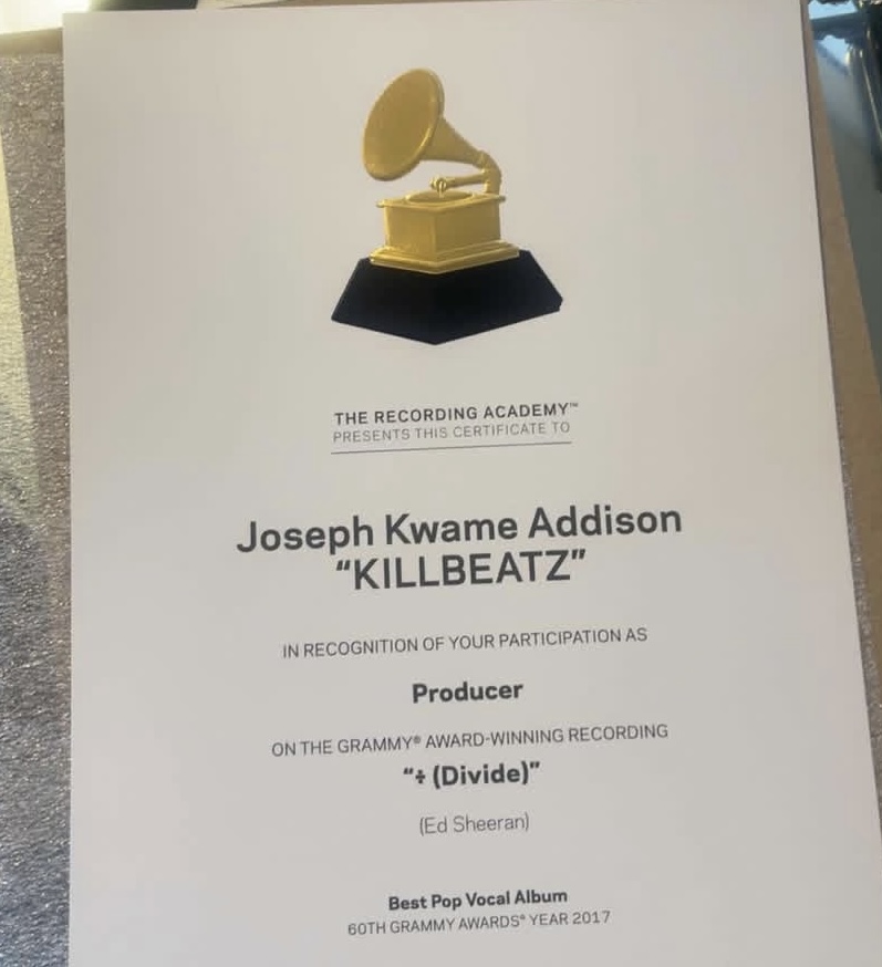 The certificate, which surfaced publicly on April 13th, 2026 acknowledges Killbeatz, born Joseph Kwame Addison, as a producer on the globally acclaimed project, which won Best Pop Vocal Album at the 60th Annual Grammy Awards.