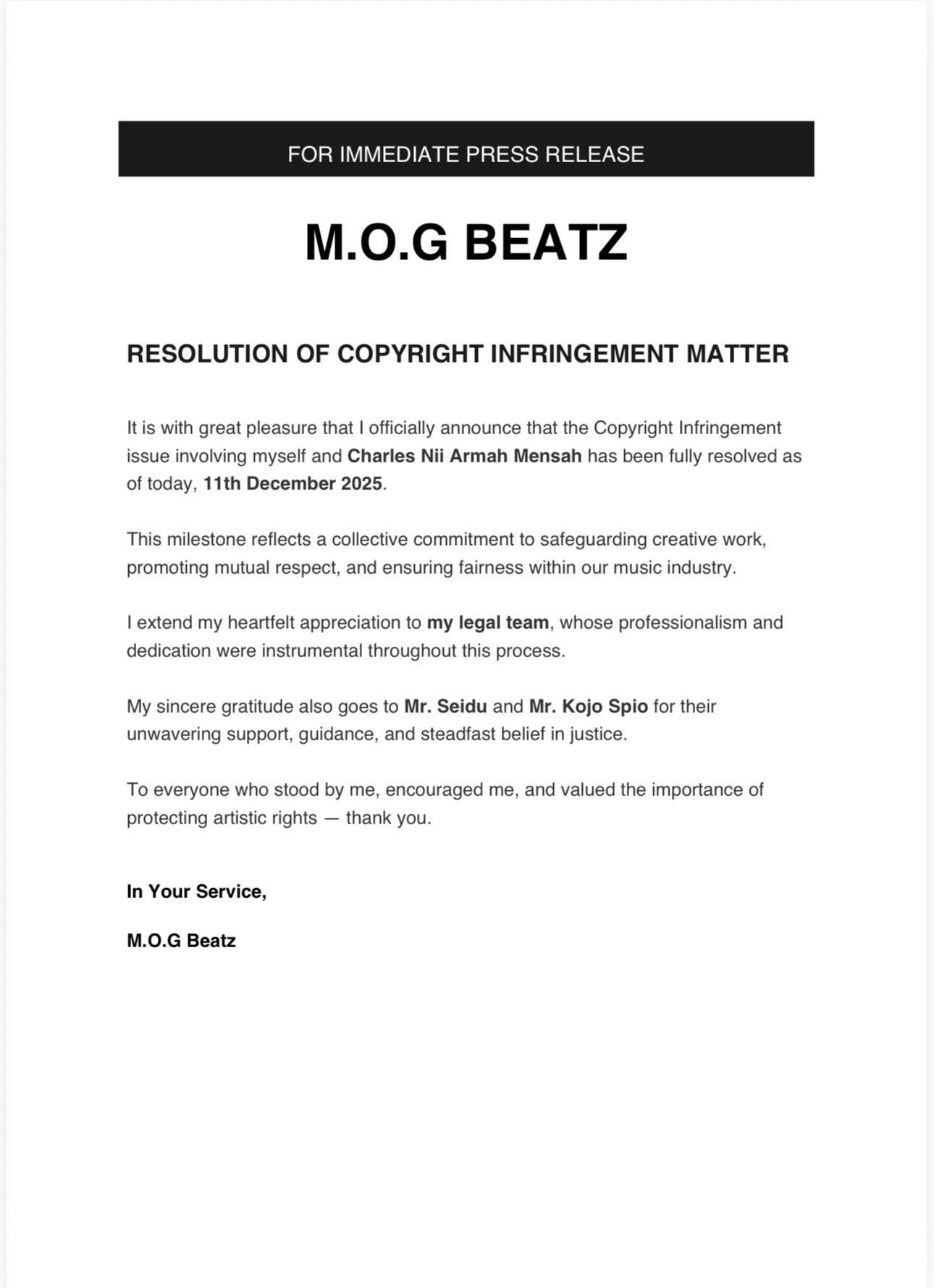 Ghanaian award-winning record producer M.O.G Beatz has officially announced the successful resolution of the long-standing copyright infringement matter involving himself and dancehall artiste Charles Nii Armah Mensah, popularly known as Shatta Wale. The producer revealed the update in a formal press statement released today, 11th December 2025.