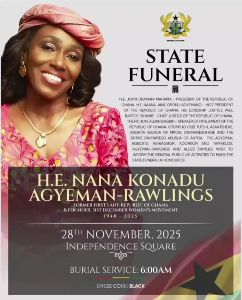 Ghana today bid farewell to former First Lady Nana Konadu Agyeman-Rawlings, who was laid to rest on Friday, November 28, 2025, after a solemn state funeral that drew dignitaries, political leaders, diplomats and hundreds of mourners.