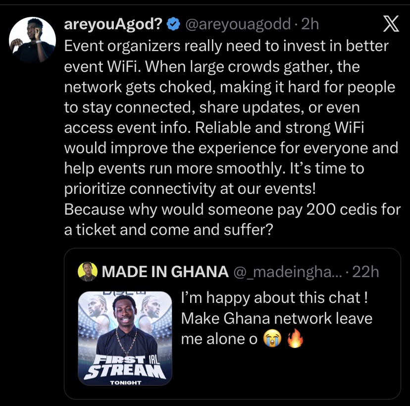 For many, the failed stream highlighted a recurring issue within Ghana’s growing digital and creator economy, unreliable internet infrastructure at large-scale events. As IRL streaming becomes a major tool for audience growth and monetization worldwide, creators in Ghana often find themselves limited not by creativity or ambition, but by access to stable, high-speed connectivity.