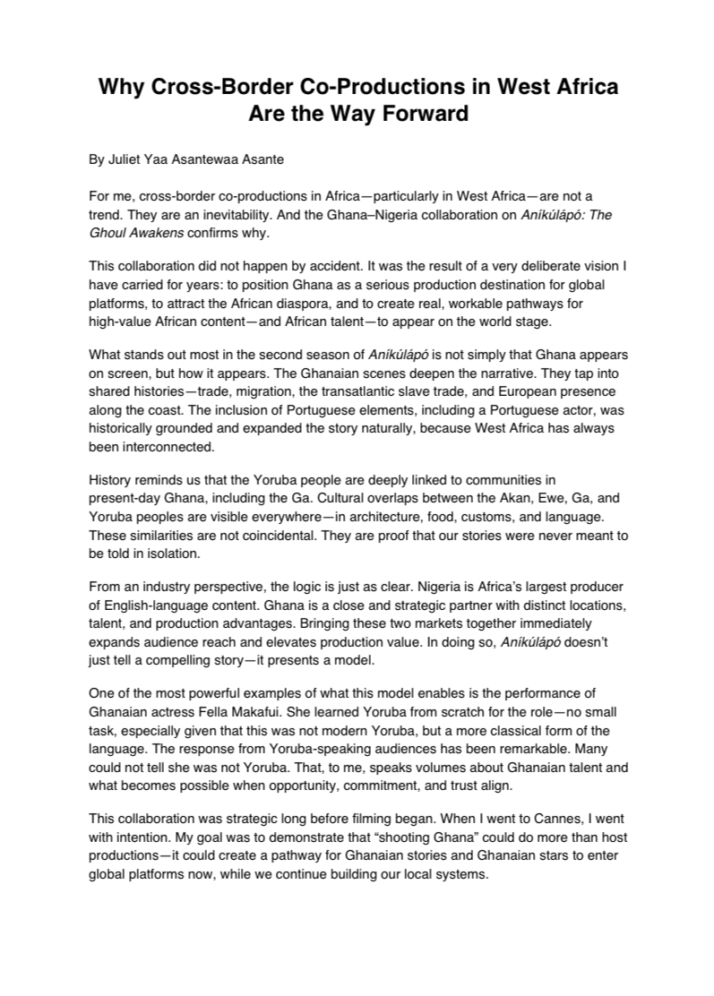 Cross-border co-productions in West Africa are no longer a trend but an inevitability, according to film producer and industry executive Juliet Yaa Asantewaa Asante. The Ghana–Nigeria collaboration on ANÍKÚLÁPÓ: THE GHOUL AWAKENS offers a clear example of why regional partnerships are shaping the future of African storytelling.
